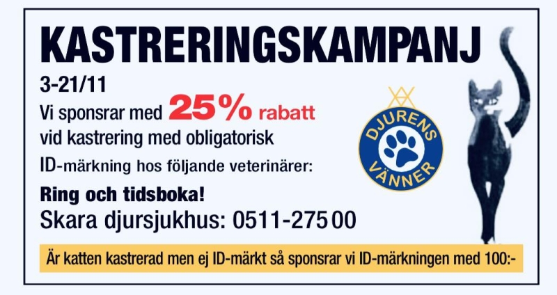 Just nu har vi kastreringskampanj i samarbete med Djurens Vänner i Lidköping! (vecka 45-47)